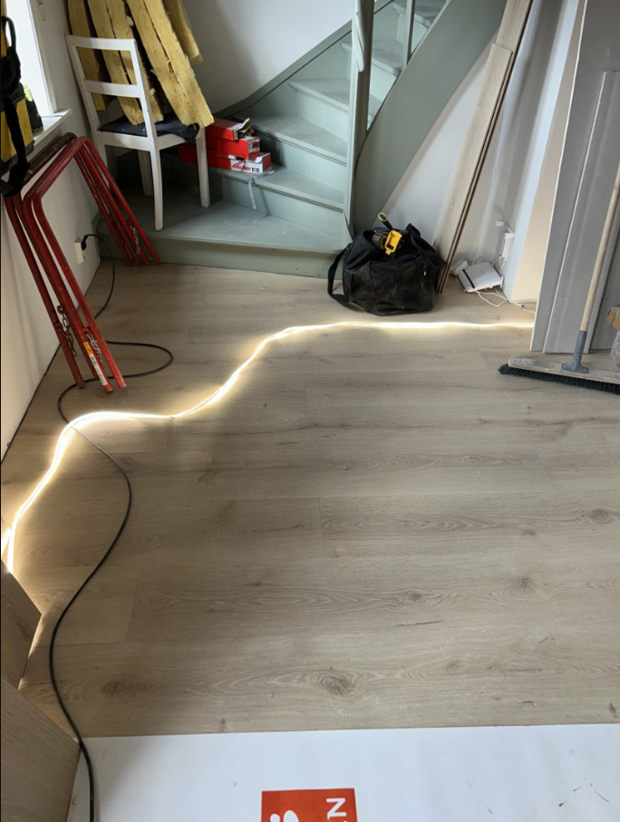 Vi har revet eksisterende kjøkken og tilhørende vegger. Åpnet vegg for å synliggjøre gammel tegl vegg og behandlet denne. Revet eksisterende tak og montert ny gips i hele arealet. Lagt nytt gulv i hele arealet. Laget åpning under trapp og laget «lekerom» for barna. Montert takmontert ventilator.