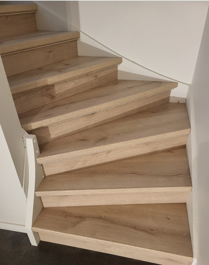 Kledd inn trappetrinn med lik laminat som i resten leiligheten. Kunden har selv lagt gulv i leilighet, vi hjalp kun med trappene.